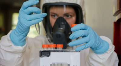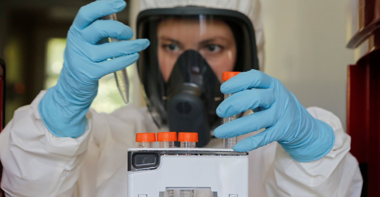 A scientist works inside a laboratory of the Gamaleya Research Institute of Epidemiology and Microbiology during the production and laboratory testing of a vaccine against the coronavirus disease (COVID-19), in Moscow, Russia August 6, 2020. Picture taken August 6, 2020. The Russian Direct Investment Fund (RDIF)/Handout via REUTERS