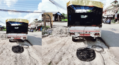 Workers from the Transportation Association protest by queuing up their vehicles from Sukedhara to Chabahil,