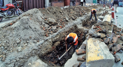 The crossroads at Saugal, Lalitpur has not been dry since Sunday. Water has been continuously