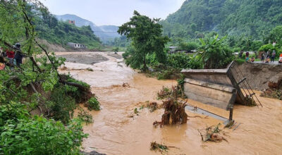 Works to fix a Bailey bridge over the Chhabdi River along the Buddhasingh Marga have