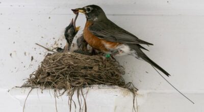 (AP) — A plump robin wearing a tiny metal backpack with an antenna hops around