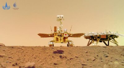 (AP) — The dusty, rocky Martian surface and a Chinese rover and lander bearing small