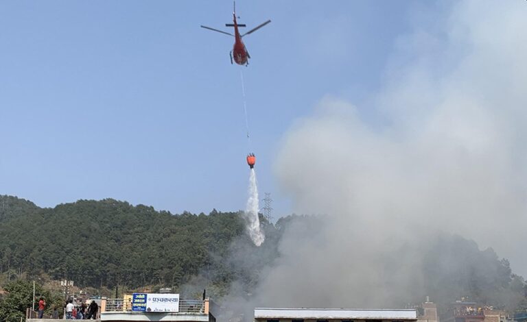 Minister for Labour, Employment and Social Security Krishna Kumar Shrestha had come to Damauli from Kathmandu in a Simric Air helicopter carrying water after the fire got out of control.
