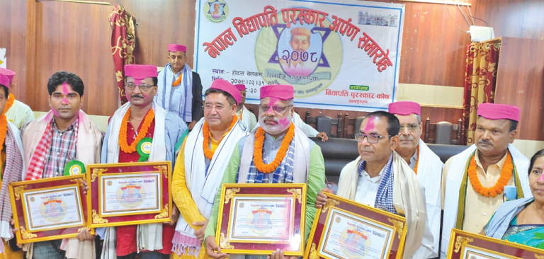 At the award ceremony held at Kosh Janakpurdham, Minister of Culture, Tourism and Civil Aviation Jeevan Ram Shrestha presented the Nepal Vidyapati Award 2078 to five creators of various literary genera. Minister Shrestha presented Nepal Vidyapati Maithili Language Literature Award to Rameshranjan Jha, Nepal Vidyapati Maithili Art Culture Award to Nirmala Jha and Ashok Kumar Dutt, Nepal Vidyapati Research Award to Surya Prasad Yadav and Nepal Vidyapati Manuscript Award to Arjun Prasad Gupta.