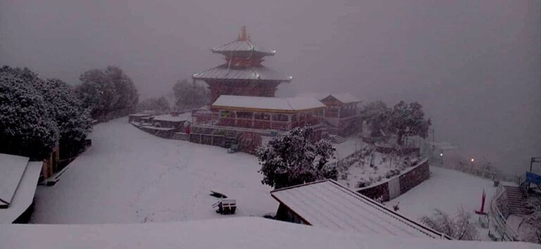 Snowfall took place in Chandragiri hill this morning along with light drizzle since last night. This is the first time snowfall capped the Chandragiri hill in the winter this year.