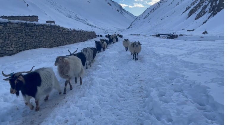 Mountain goats and sheep walk through snowy paths while being brought to the lower Dolpa following heavy snowfall in the upper Dolpa, Dec. 20, 2021. Photo: Hemanta KC/RSS