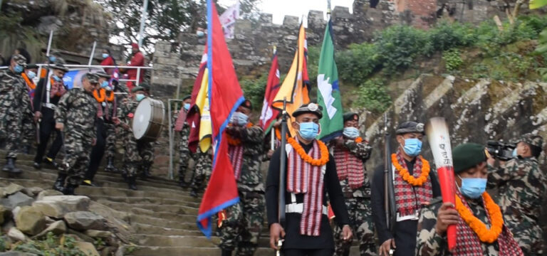 The team consists of 10 soldiers dressed in traditional Nepali Army uniform (black cloth) and 40 others including 30 soldiers in current army uniform. “Our team will reach Bhimsen Thapa Rural Municipality-8 Ghatbensi and hand over torches and flags to the Shiv Dal battalion of Dhading,” said Major Pariyar.