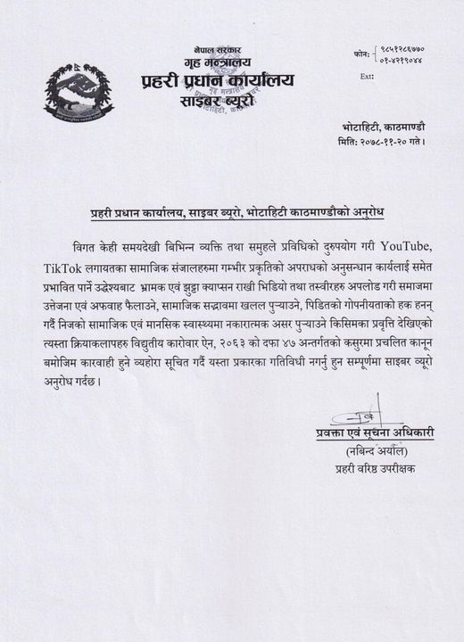 The cyber bureau of Nepal Police has warned of action against those spreading rumours on social networking sites and disturbing peace. The individuals or groups of people who have spread rumours and put videos and photos with fake captions on social networking sites like YouTube or TikTok would face action, it warned in a notice on Friday.