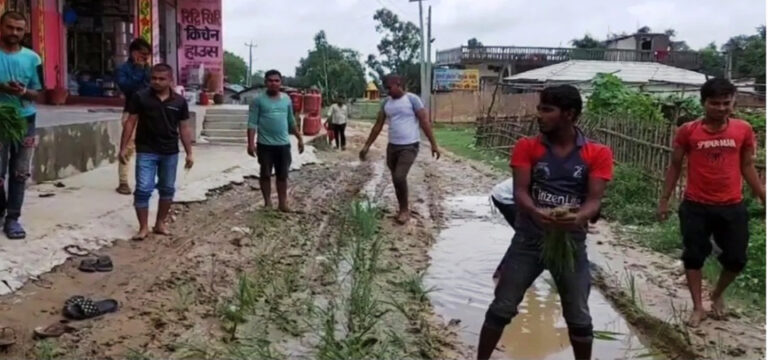 The youth demonstrated the symbolic protest by planting rice on the road of Dhrubkunda.