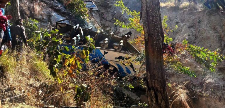 CDO Khatiwada share that as many as 14 people died and five others were critically injured when a passenger-ferrying bus en route to Damak, Jhapa from Okharbote Bazaar of Madi, Sankhuwasava fell some 300 meters off the road at Madi Municipality-6, Saatghumti this morning.