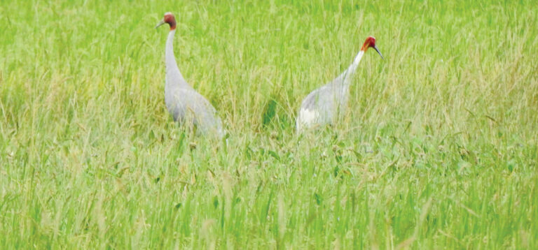 According to ornithologist Hirulal Dangaura, the Sarus cranes were sighted at the lake area this year after the water body of the past has been turned into arable land. “There is water and paddy in the lake area,” he said. A pair of Sarus crane is seen in the paddy field,” he said.
