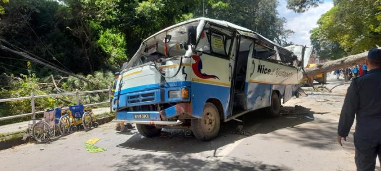 Rudra Devi Sharma, Chief District Office of Bhaktapur, informed that a pine tree fell over the bus heading to Bhaktapur and a scooter, and three persons were killed and 15 injured.
