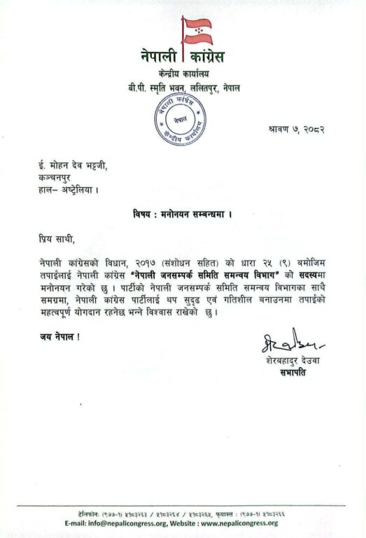 Sydney, July 25 – Prominent Nepali social worker, businessman, and engineer Mr. Mohan Dev Bhatt, currently based in Sydney, Australia, has been appointed as a central member of the Nepali Janasamparka Samiti Samanwaye Bibhag (NJSSB) — a key coordination wing of the Nepali Congress Party that connects with the global Nepali diaspora that align with Nepal’s first opposition party Nepali congress.